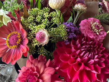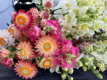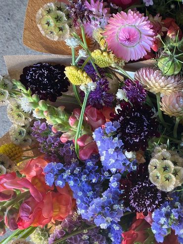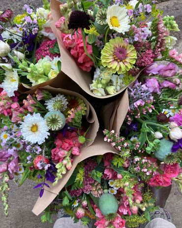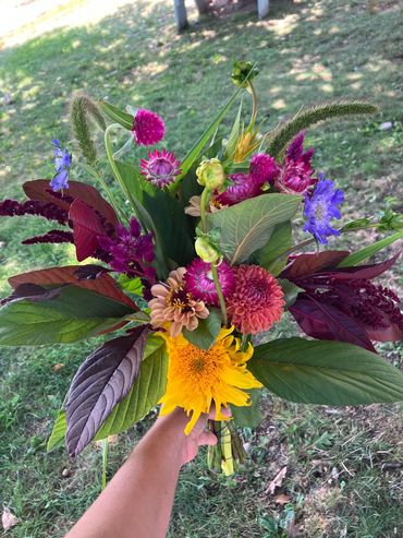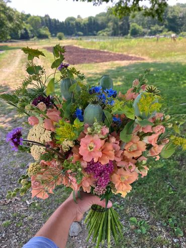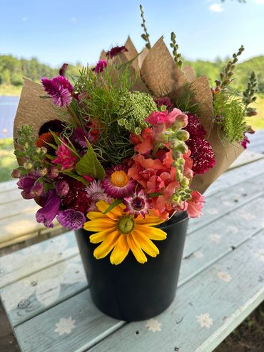 Eight weeks in July and August, once a week pick up on the farm or at market you will receive a large, colorful, summer fresh bouquet. All flowers are grown on our farm and arranged by us. Flowers will range in color and variety weekly.